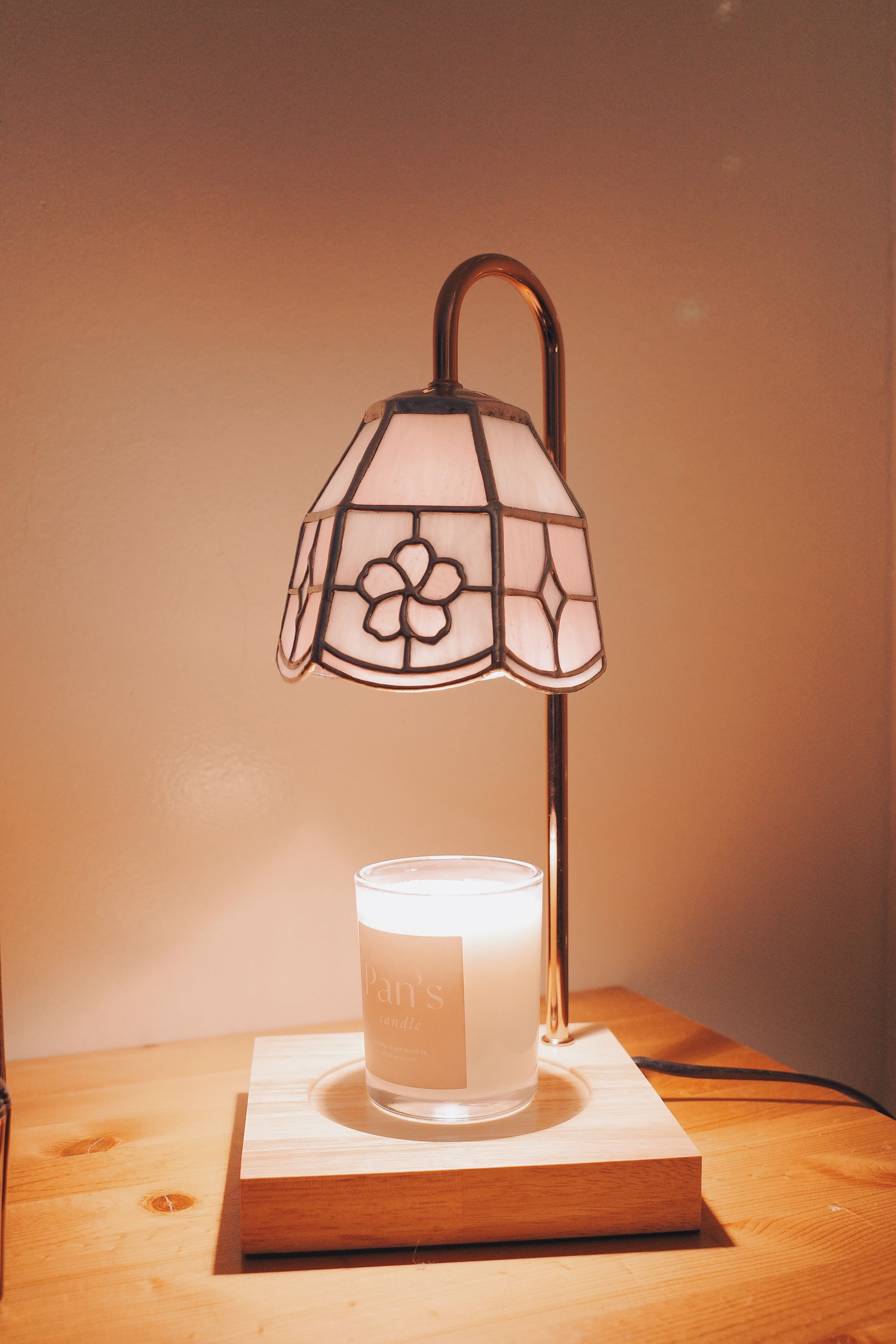 燈罩:玻璃、銅箔、錫、銅蓋 燈座:木底座、電線、燈泡